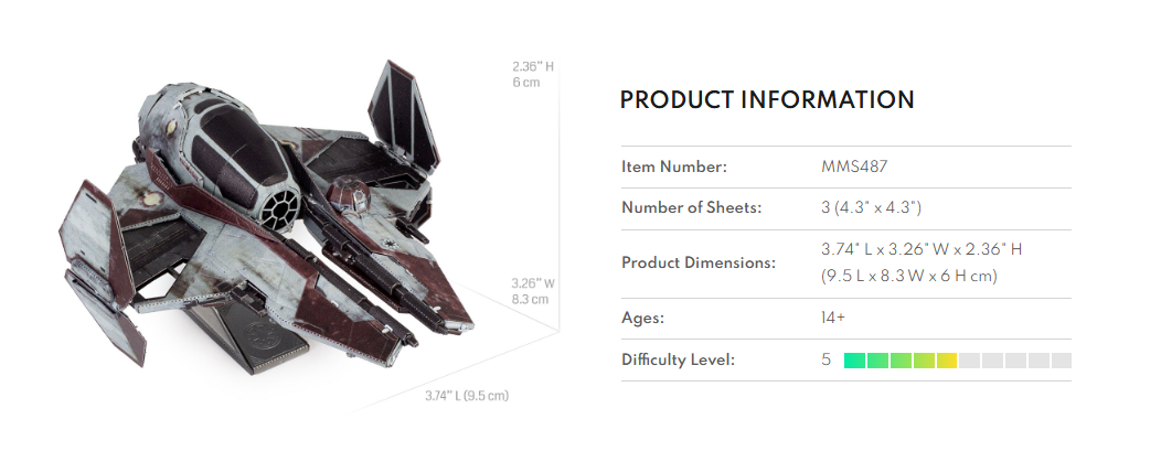 Officially Licensed STAR WARS™ Metal Model Metal Earth kits allow you to craft detailed models from flat metal sheets. This rewarding hobby is perfect for anyone aged 14 and up. This DIY Metal Model Kit is built from parts formed from three 4"x4" metal sheets. It starts as flat metal sheets with intricate details etched into individual pieces. A set of easy-to-follow instructions is included, and no glue or solder is required. Simply snip out the pieces and bend the tabs through the corresponding connection points.