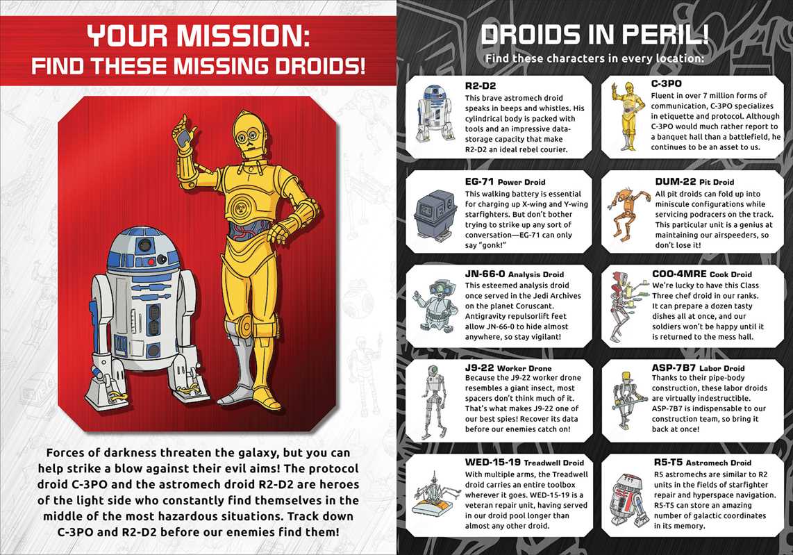Can you find these droids before the Stormtroopers do? Search for R2-D2, C-3PO, BB-8, and more of your favorite Star Wars droids in this interactive search-and-find with locations from across the Skywalker Saga.