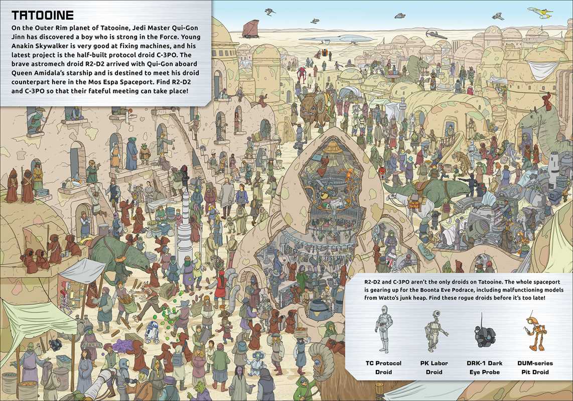 The Stormtroopers are looking for droids, and your mission is to find R2-D2, C-3PO, BB-8, and other Star Wars droids and characters as they journey throughout the galaxy in this interactive search-and-find. With nine scenes from Naboo, Hoth, Exegol, and other locations from across the Skywalker Saga, this book is full of non-stop fun for every Star Wars fan. Four additional activities are also included.