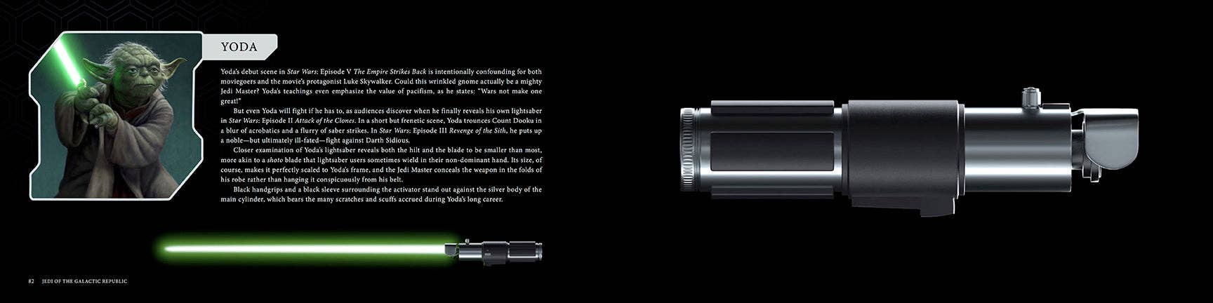 Each spread features a detailed illustration of each lightsaber, allowing readers to see the intricate detail in the hilts and the brilliance of each energy blade, as well as information about the construction and additional filmmaker anecdotes about the creation of each weapon.