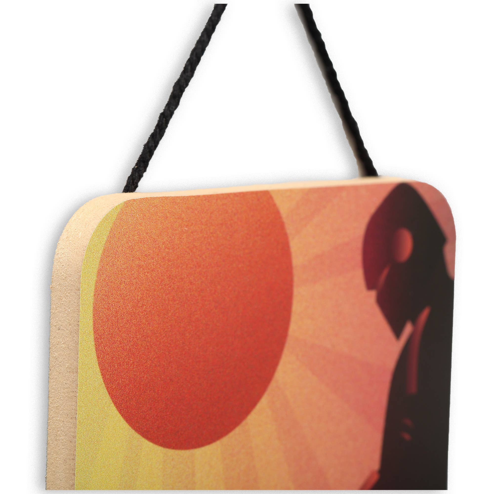 Star Wars official product: Protect The Child at any cost with this full-color wall decor! Featuring The Mandalorian and The Child floating in his bassinet in front of a shining sun, this classic movie depiction is a must-have for any Star Wars fanatic.